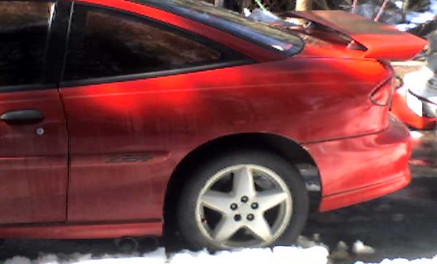 About a year later, the oil-pump seized on the 2.3 DOHC hybrid, causing one of the already tired rod bearings to go out for lunch, despite catching the no-oil-pressure almost instantly. The engine now needed a new crank to be up to snuff, so I started looking around. I ended up getting a good deal on a newer, low-mileage LD9 Twin Cam from an '01 GA before I ever found a good crank for the 2.3, and so I dropped that in instead. The newer LD9 has a little higher compression ratio, and ditches the EGR that I love to hate. While it was going in, I decided to add a little IHI turbocharger and intercooler, both sourced from a Ford 2.3 Thunder Coupe T-Bird with low miles. I added an e-bay special Blow Off Valve and a boost-controller, and built a 2.5" full mandrel-bent short-run side-outlet exhaust for the car. Now I had one ripping little Z -this car kept up with my 3800SC GTU, at least up to ~75-80 MPH- for a total investment of around $750, including both engines and the turbo work. A couple of years ago, I was given a pair of steel Z-3 style vent-fenders for the car, so I prepped them and painted them myself with a decent automotive-grade color-match PPG paint and clear-coat -they turned out alright, considering that I had to build my own hot-box spray booth and am NOT a professional painter. I also bolted on a Fiero GT wing spoiler -any bigger and the car would look silly to me. I already had red metallic fader window-tint on the car (it needs to be redone now, most of the red has 'faded' to silver
