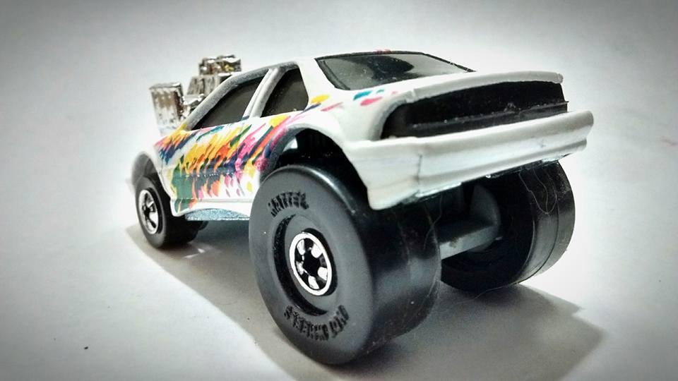 found out its actually a" Hot Wheels" 90's Chevy Beretta Super Cal. Custom (White /Rainbow Accents). Some of the other ones ive seen have smaller (more realistic) sized slicks in the rear.