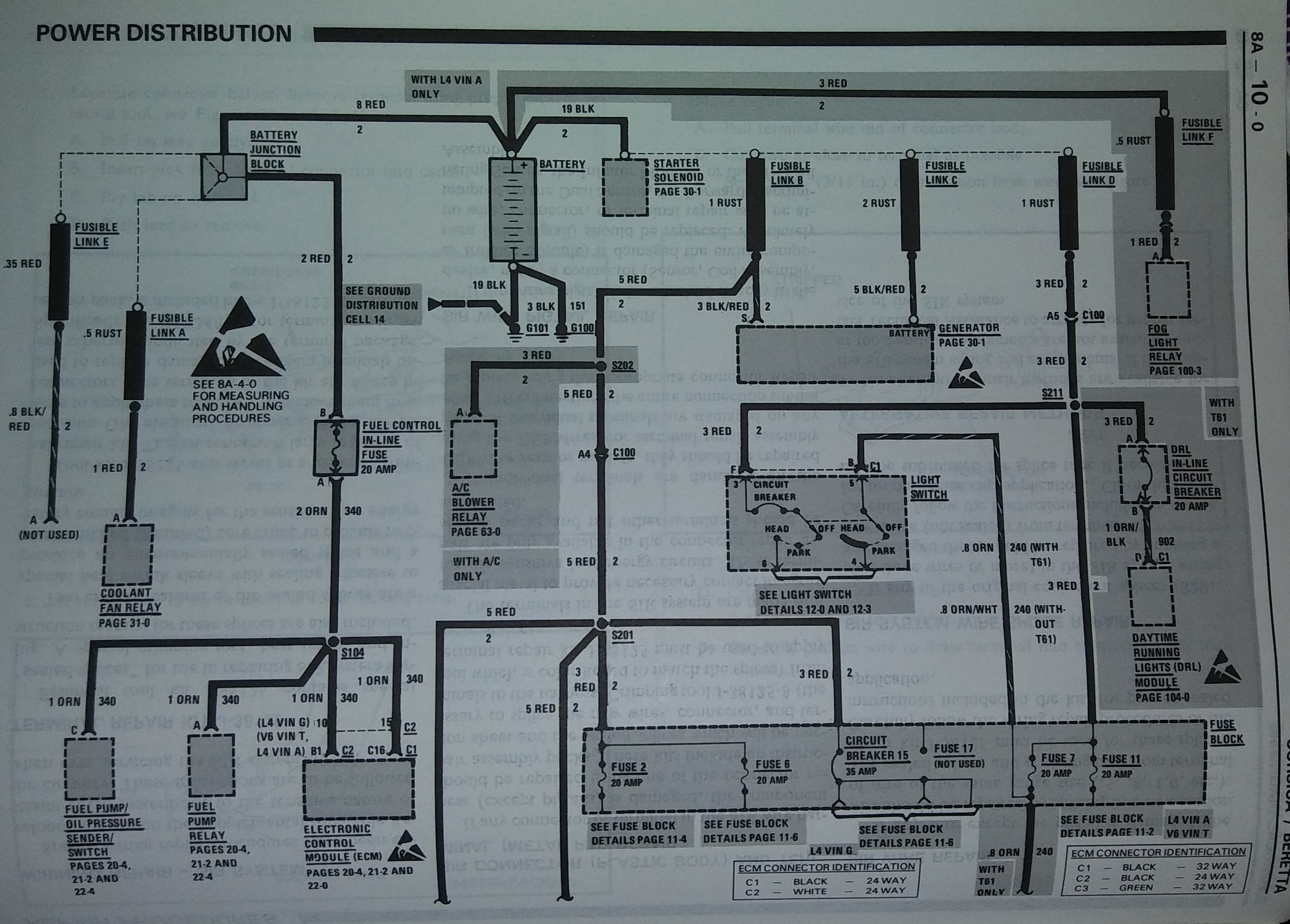 If you have a 1990 Beretta Indy service manual reference the electrical section in pages 8A-10 for power distribution, and 8A-150-0 for Battery, and the headlights are in there as well.