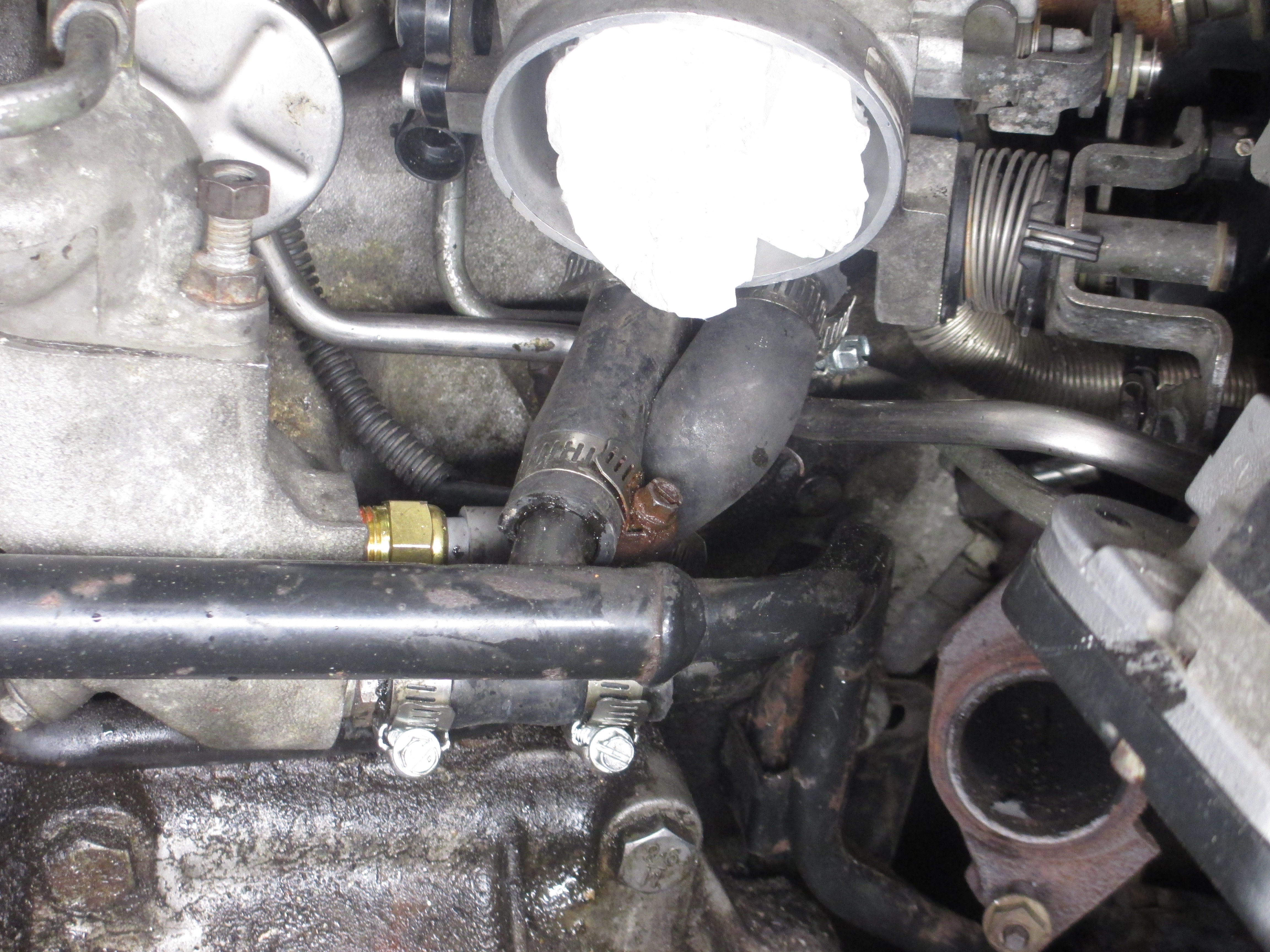 I kind of needed to get all of this out of the way to deal with the coolant hoses. The pic doesn't show, but I believe the one is a quick-connect o-ring fitting from the factory. Someone had ditched this and put a regular hose nipple in the thermostat housing. They just put a short piece of hose on (too short) and 2 clamps.