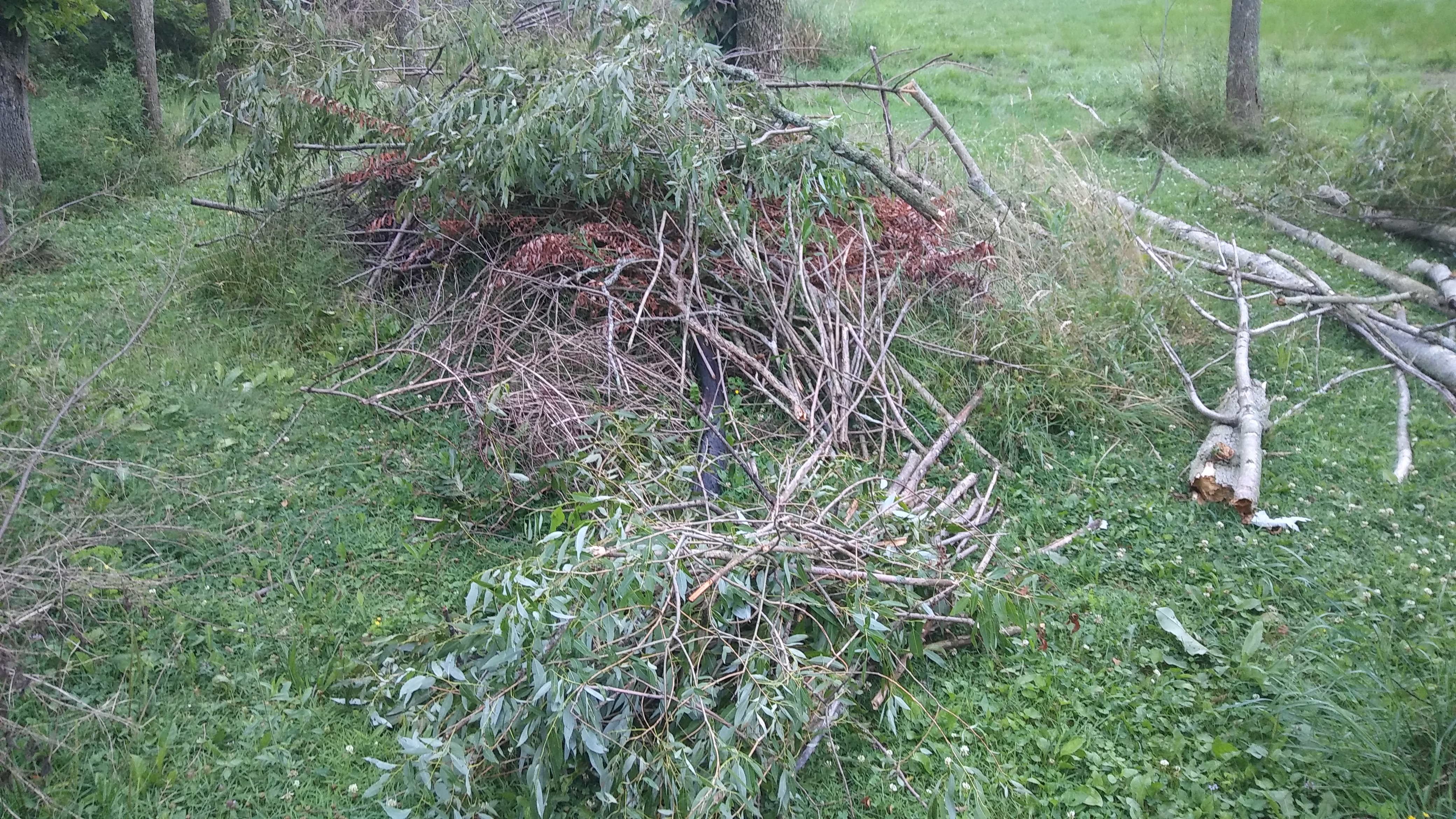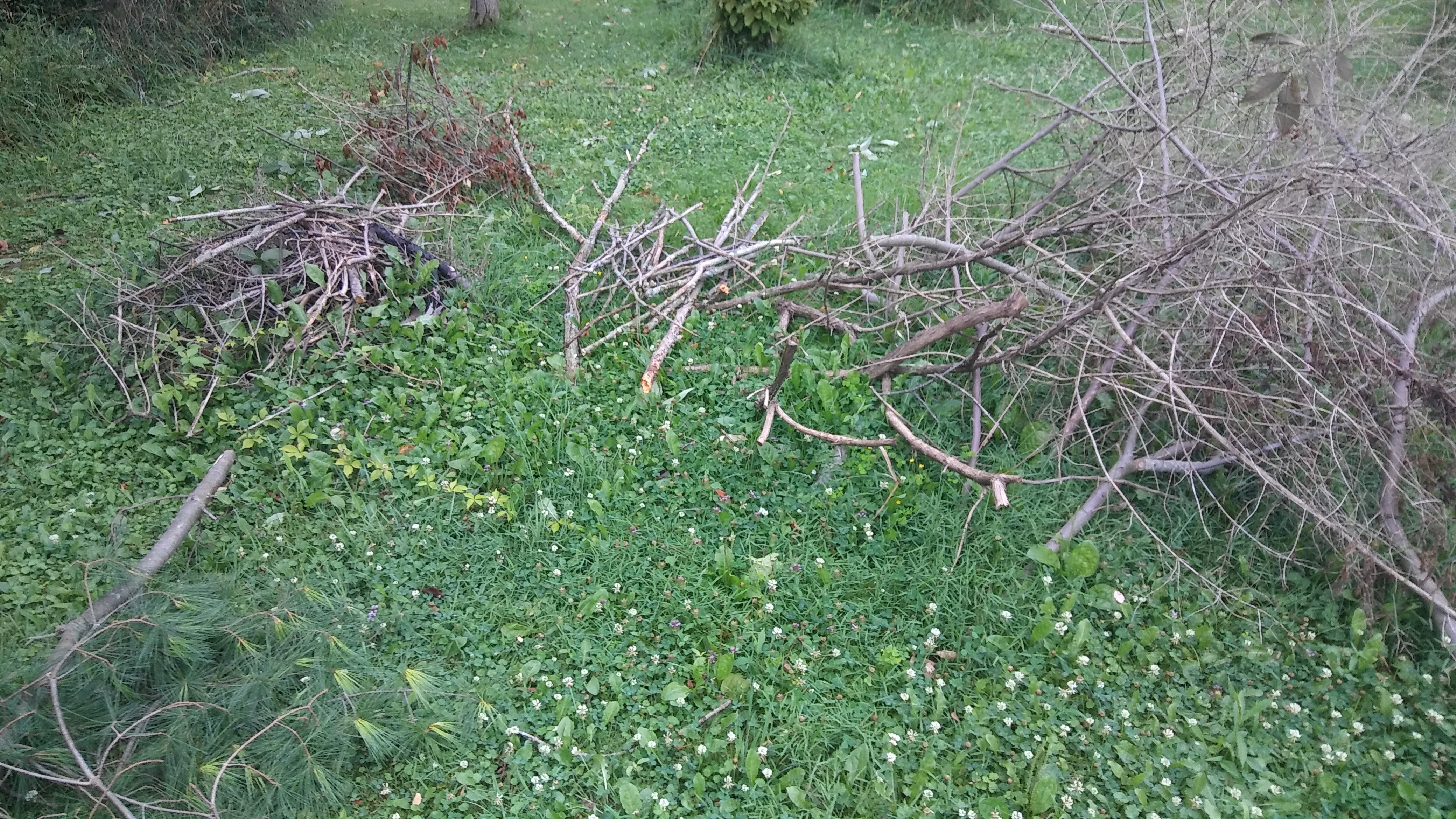 The trees on the grass, I carried them there because the storm took them down, I didn't cut them up yet.