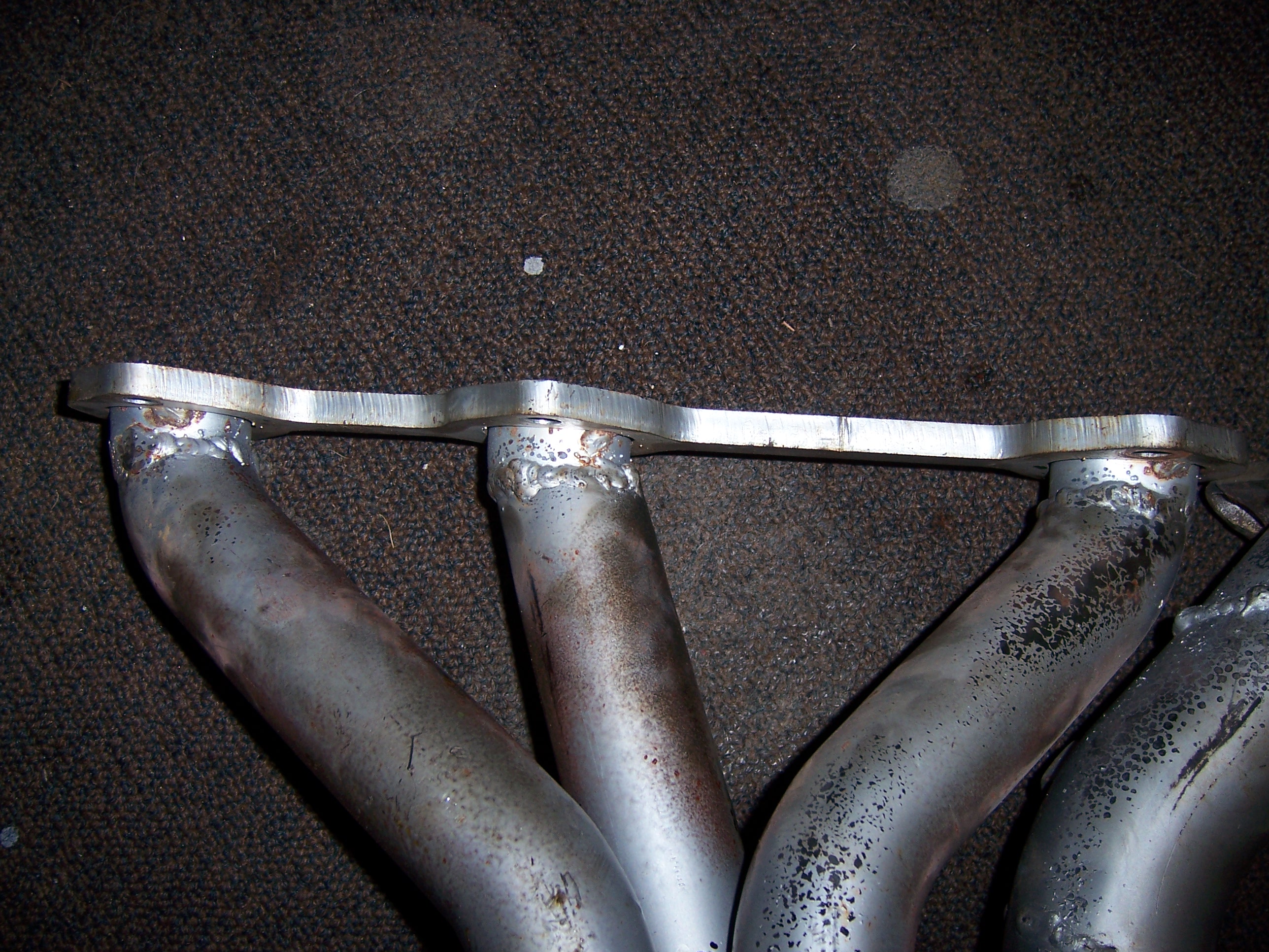 Completed header Last collector cut and weld. Cross over hacks, It could have been done it one cut on each side but since I didn't have both on the same motor it took me two or three shots. Bottom of rear down tubes. Angle of mine Comparison to unmodified... the rear flange does angle it a little more too since its not flat. Collector comparison collector flatness comparison.