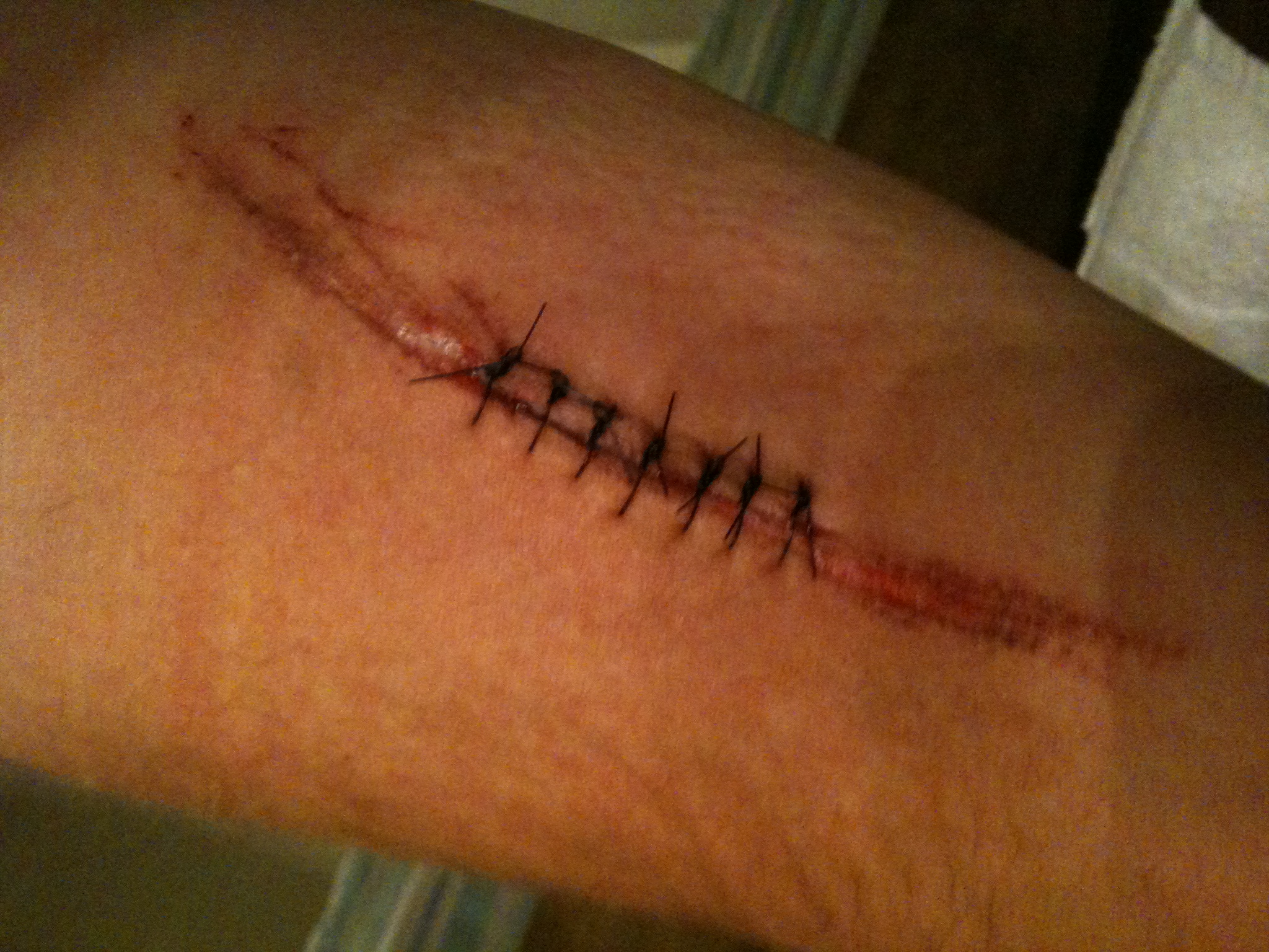 Here's the carnage photos. It opened up to about 3/4" wide hence the need for the stitches... Otherwise I probably would have just pulled it shut with wound closure strips.