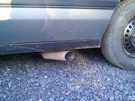 my buddy and i welded together this monster. yes im losing tq and hp but it sounds frickin crazy! from stock downpipe to 3in sec. - 5in sec "resonator" - 3 in. out the side. hahaha