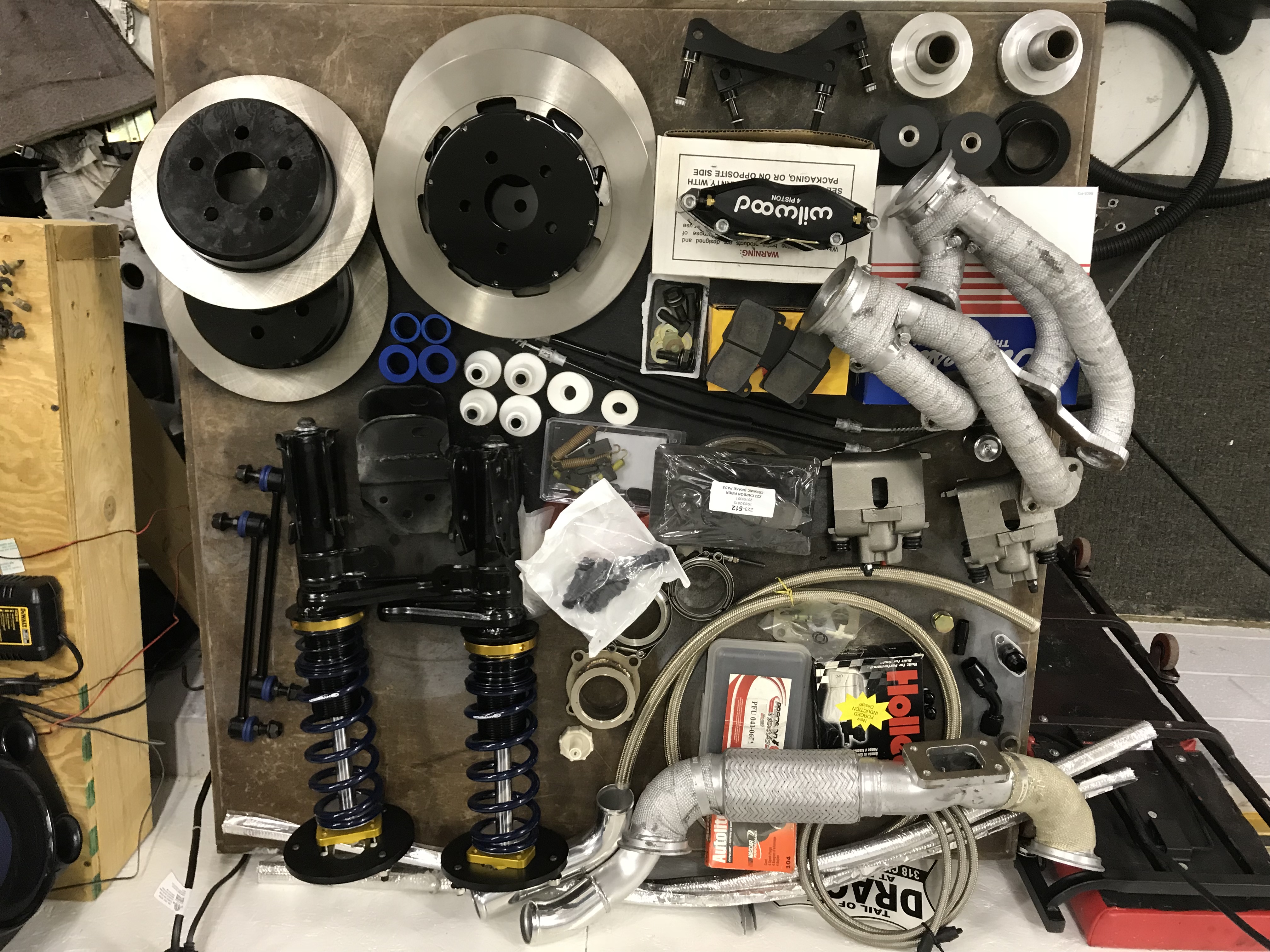 I did get the coil overs fully assembled and torqued down, and laid out a few of the parts I hope to get onto the car next weekend...