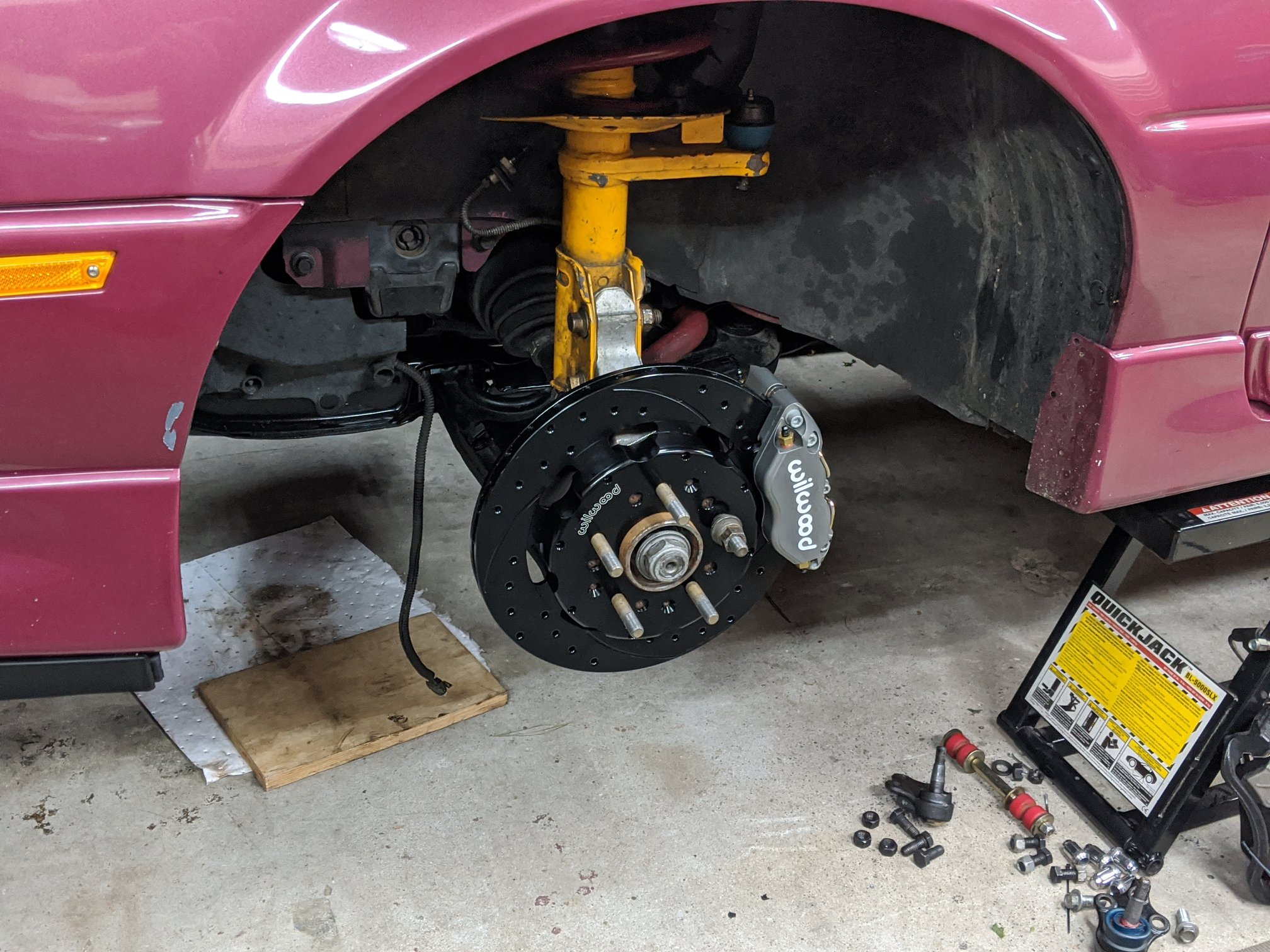 This project took a bit of fitting since I bought a 2000 Camaro Drag Race kit assuming it would fit since I can run 2000 Camaro brakes. Long story short, Factory brakes the abutment bracket mounts to the inside of the knuckle, Wilwood decided to mount theirs to the back side of the knuckle, and the N-body one isn't as thick as the F-body one. This resulted it me having to source a shorter rotor hat to bring the offset in. Thankfully I found a combo that worked and helped the rotor also clear the ball joints which was another interference issue.