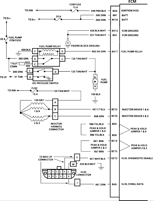 Checks for grounded "peak and hold" jumpers. This fault would allow injectors to pulse but would not allow "peak and hold" operation as current would not flow through the resistor in the ECM.