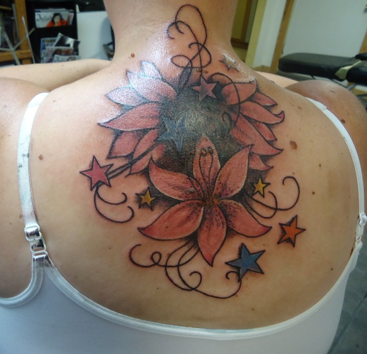 Here is my most recent one. I got it in December on my father's birthday. Its on my right shoulder blade.