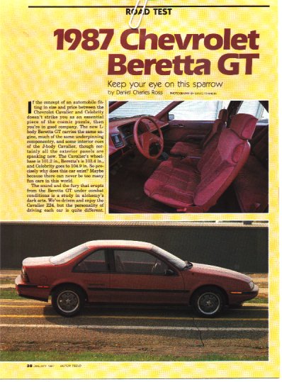 I found this article on the web. The Beretta GT was not available in 1987 (optional GT package became first became available on 1988 Beretta), however, articles were published as early as October 1986 (click here to read some of these articles on the Main Page of the Models Section Technical Section). If you have every spoken to a reporter and read the article later, you know errors are made. Note, while the Beretta pictured in this article is called a GT, notice the base model steering wheel with the upgraded GT interior.