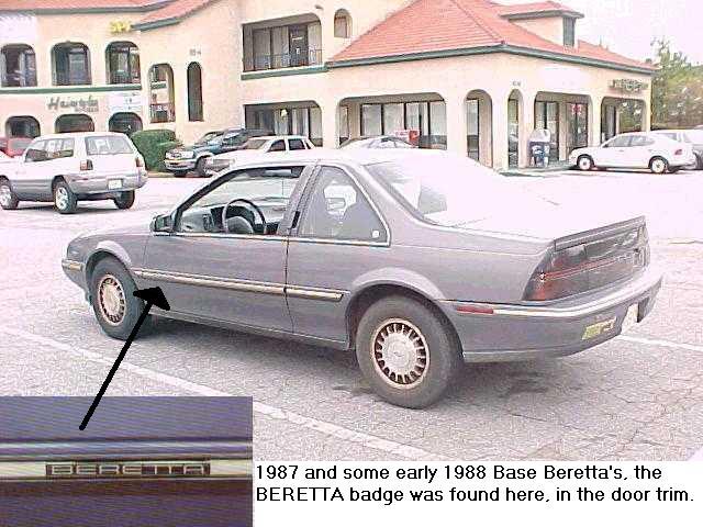 I'm sure data on the 1987 Beretta is lost somewhere. As far as I can tell, the 1987 Beretta is identical to the 1988 model. The only differences I can find are minor cosmetic changes to interior and exterior. Example, on all cars produced before 12/1987 (meaning cars manufactured in 1987 but registered as 1988 models), the seatbelts were attached to the pillar, like in this interior pic of a1988 Beretta. Notice the door paneling, here is a second map pocket, also notice the handle on the door swoops downward.