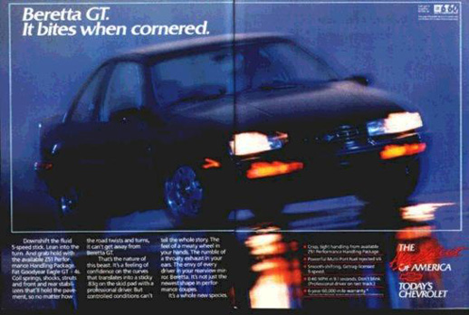 Introduced to the public as a 1988 model in the fall of 1987, Beretta was initially sold to rental car agencies for testing and evaluation purposes. By sending to rental agencies, GM could test market the car to the public and catch quality problems. The plan worked, Public response was HUGE! Over 275,000 Beretta's rolled out to the public in it's first year of production. The Beretta's styling aged well in it's eight year run and benefited from its Chevy-exclusive status (body style and shape were not shared on other GM products); a rarity in the cookie-cutter world of General Motors. The Beretta impressed car mags as a sporty, quick coupe. A few didn't care for the early model interior (common quote "the interior was out of harmony with the exterior"), however, its aerodynamic looks and long list of standard equipment made it a hot seller. GM had a winner on its hands.