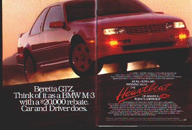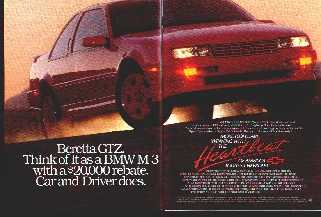 MAJOR interior updates, including new dashboard/center console and a drivers side airbag is added. Seat belts are mounted in the pillar (again), a new blend option on climate controls allows driver to use defrost and heat simultaneously, heat ducts under driver and passenger seat help keep rear occupants warm. Power trunk button is moved from inside the arm rest to the center console. Ashtray is moved from just under the climate control to just behind the now optional (on base model) arm rest. Ashtray now doubles as a cup holder. New Dual Cup holders are on the passenger side of the dash, just above the glove box. Electronic gage package is no longer available. Base steering wheel sport a silver Chevy bowtie on the airbag cover, GT & GTZ steering wheels sport red Chevy bowties (GM glued them on, mine peeled off my 1991 Beretta in late 1991). 1992 through1996 the bowtie emblem is simply an outline on the airbag, Gone is the storage bin, the one under the steering wheel on the drivers side. Perhaps the most celebrated change, NEW & IMPROVED map pockets! Beretta comes in fewer color options this year (red, blue, turquoise, white, black and maroon). Interior color is limited to gray, blue, maroon and black (which is only available in cars with white, black or red paint). Exterior changes on Base Beretta include a new solid paint appearance, no more black side trim on doors/bumpers. GT and GTZ take it further with body colored grill and side mirrors. Cross lace alloy rims are now standard on GT model. Color-keyed lace-spoke alloys are an available optionon GT, along with revised graphics. A CD player is newly optional on all models. GTZ can be ordered with the more tame 3.1-liter V6 found in other Berettas so that folks who hate to shift their own gears can get a GTZ with an automatic transmission. All Quad four GTZs come with a five-speed only.