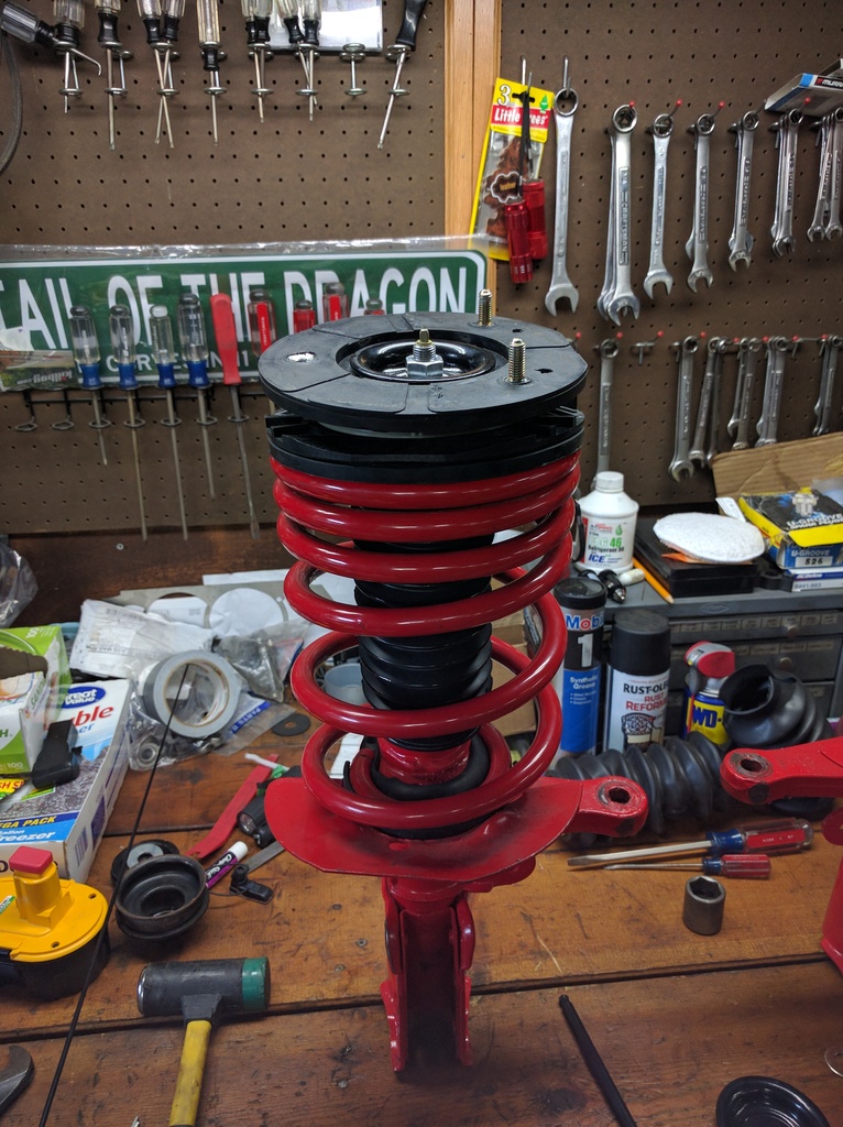 Procedure for front strut build is below, I have more photos towards the end of the thread with my custom bushings I made.