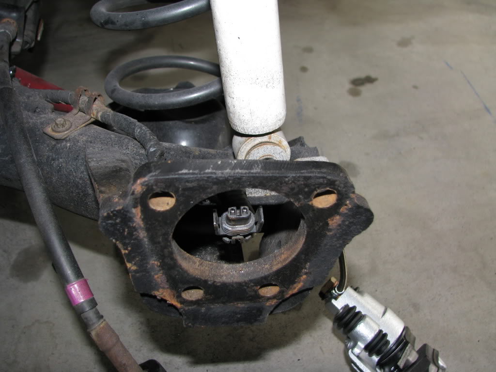 Fed line through rear subframe assy, nice clean install. I used 5 7/16 stainless washers to space the rotor out a tiny bit so it wouldn't touch the dust backing plate. Our bearings are slightly shorter than what the neon had there so you need to space it out about .080" This has also pushed my wheels out a good amounts, so I'll have to look at rolling my fenders some how and I'll have to be careful not to crack the paint on the inside edge... since once that happens it can start to flake off and could work its way around to the outside where its visible.