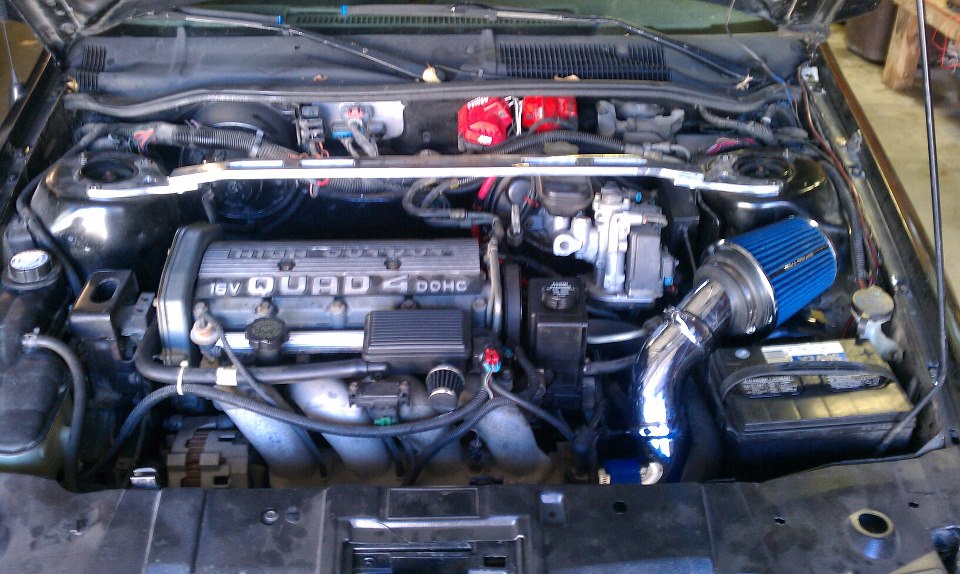 Bought a 97 Cavalier Z24 with the 2.4 Twin Cam for cheap had been in a wreck thought i could fix it but i decided to just pull the MSD coil packs and throttle body spacer. Put the coil packs on real quick and put em where the intake was. Finally got the time to pull the cruise control and put the coil packs there instead and put my intake back on. Still runs the same just looks nice gunna paint it blue here soon. Few other little things i wanna do still: Short throw shifter, paint soon, tires, and my new filler panel on. Also put in a new radiator in a few weeks ago. Easy as pie lol