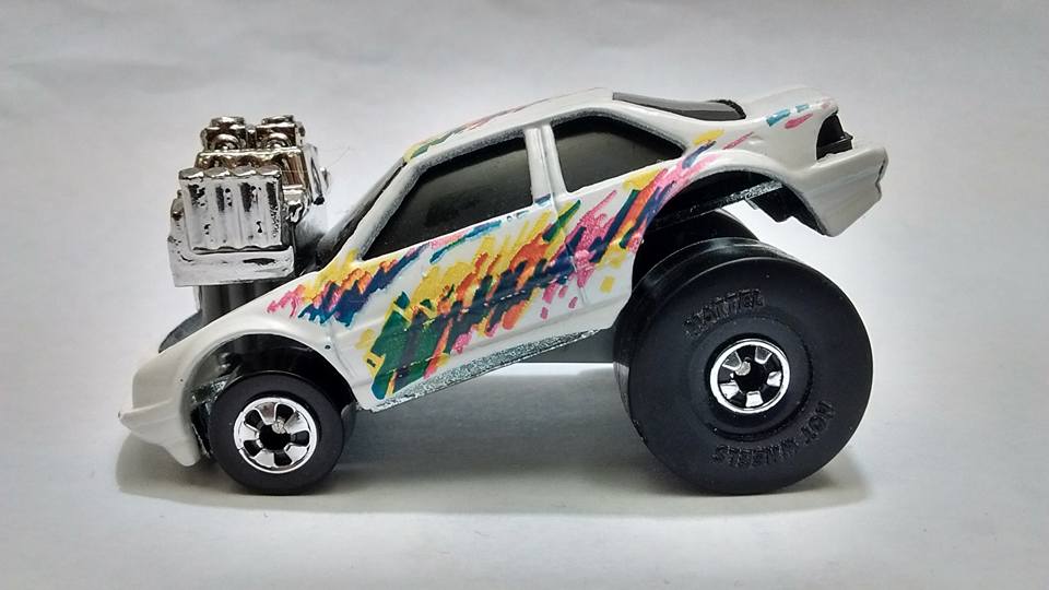 found out its actually a" Hot Wheels" 90's Chevy Beretta Super Cal. Custom (White /Rainbow Accents). Some of the other ones ive seen have smaller (more realistic) sized slicks in the rear.