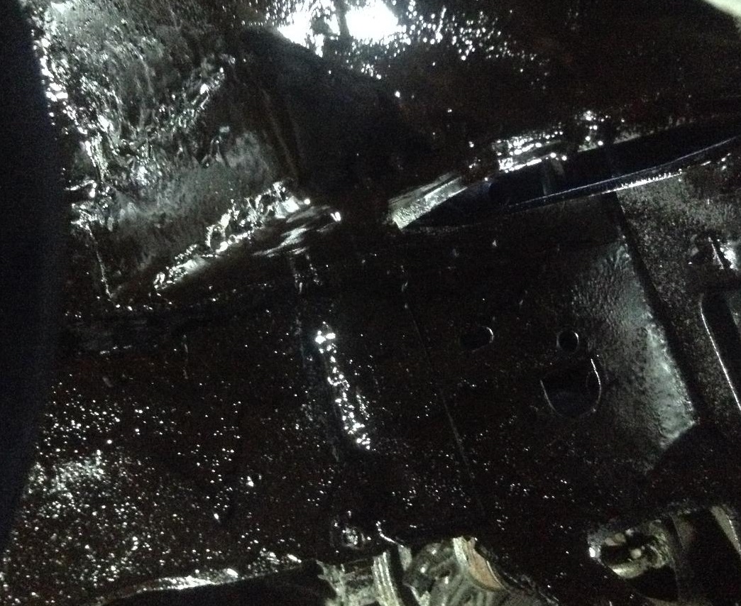 I started out building an actual battery tray out of stainless steel, but it is such a tight fit it just caused problems. So, I just grafted-in a small corner piece instead. There was about a 1.5 inch gap created in the steel, to give an idea how much the metal had to be moved to make room for the battery. Given the usual corrosion issues that batteries cause, I am glad I listened to my own complaints and upgraded to the stainless for this part. I then primed the whole area, and topped it off with rubberized undercoating. I also applied a generous coat to the underside, where it could be exposed to water. I am actually pretty happy with how this all turned out.