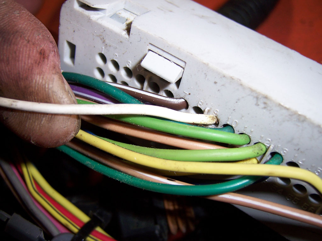 Cut the white wire on the driver's side body harness connector, PIN G5 AKA top row second from left, Looking at the back side of connector, as pictured, (natural wire curve aiming down)