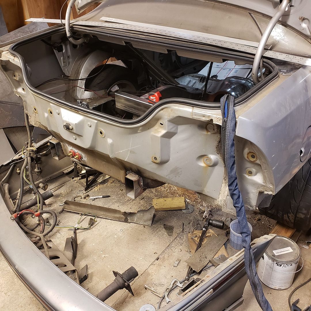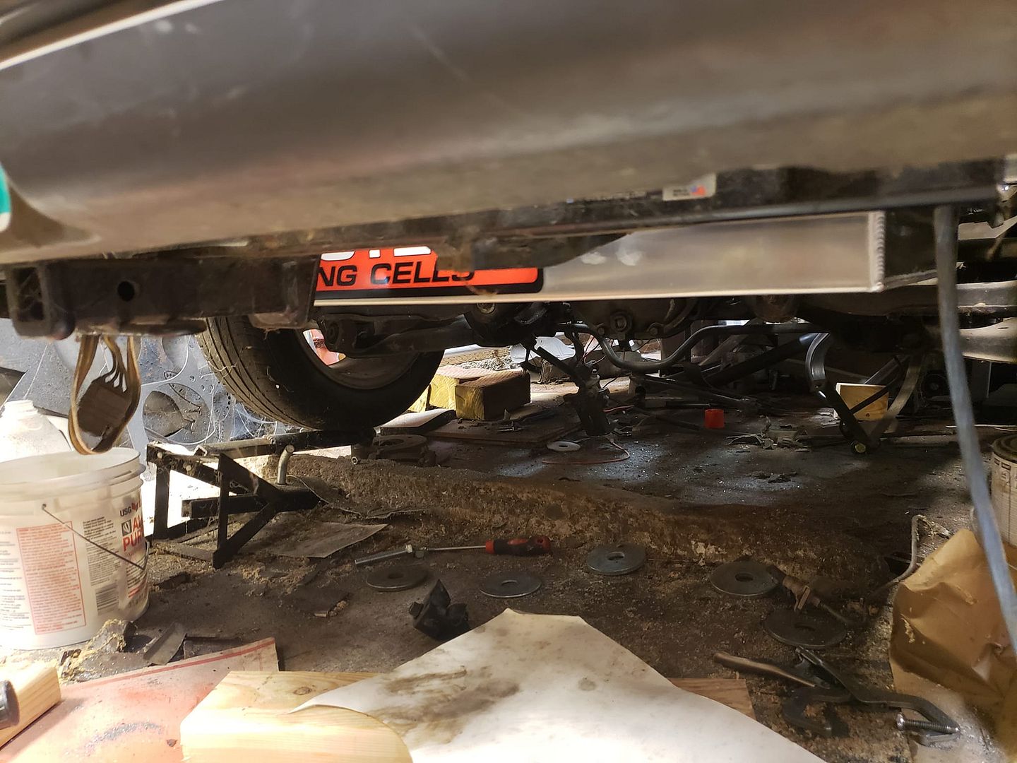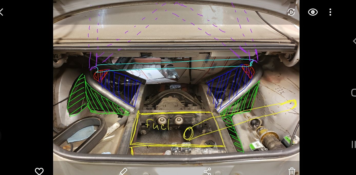 so it turns out if you run the Silverstate Classic in Nevada, you will need about 18 or so gallons of fuel in the 150mpg class with a 500hp or so car.. This is a bucketlist event I am 100% doing in this car. No matter what I came up with it, I could not get enough fuel in the car.. even with a custom made fuel cell I was still a bit shy of what I wanted. and those are about $5,000.00.. and have to be recert in 5 years, for an additional couple years added to the life.. then its expired and you start over... Big money.. The fuel cell absolutely had to be low, using the factory gas door is a requirement for me.. its a street car! thought about moving the door up.. Just didnt really like the idea. Multiple off the shelf fuel cells was not an option, the mfg didnt suggest it of multiple fuel cell companys nor could they tell me how to make it work. So.. I found a 22 gallon off the shelf fuel cell. Put even more thought into it.. checked the measurements a few times.. Placed the Order. and.. goodbye rear frame.. It was the most logical solution, and it hurt every cut..