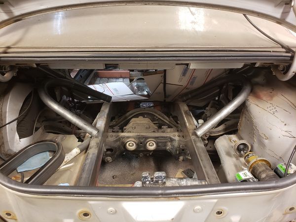 Due to moving the fuel cell back an extra 2", that ment the rear frame section was not where I wanted it..... I had to cut my factory bumper mounts off to get it in.... The bumper tubes that mount to the sheet metal bumper section will have to be remade slightly shorter, and mounted to the new frame. Really not what I wanted to do.. but it is what it is, have to move forward.