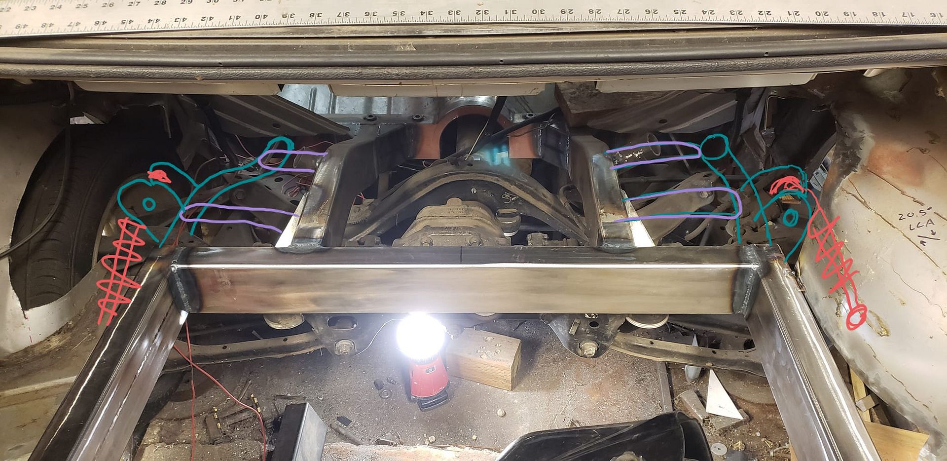I like the yellow/purple/green sketch for the coilovers. Do you think the teal is needed? I'm assuming you'll also be building a solid rear firewall like I did, but that package tray is still super flimsy. I don't see tying into that doing anything structurally.