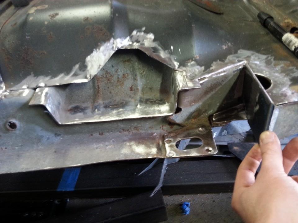 Cut out all the rot on the rear floor pan and cut the rest of the old rusted rear subframe out from under and replaced the new floor section ......almost ready to set in the body rails