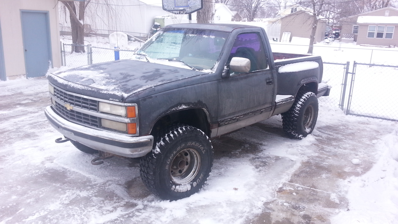 The transmission was burnt up in it from Dad using it to plow snow while it was low on transmission fluid. Oops. Burnt out the 1st/reverse packs. So, we dropped the transmission on the 23rd, he rebuilt it, and we just put it back in the truck today. Also had to fix a frozen wheel (brakes were rusted to the drum on the rear).