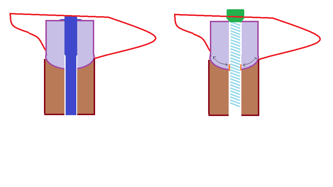 My thought is that the 'trunnion' may be pivoting with the slight side-force applied by the pushrod, which could cause impact noise against the stub, plus whatever vibrational noise as the bottom of the trunnion grinds along the top saddle of the pedestal base, and would change effective distance between lifter and rocker arm. Not much, and I really don't see how it could cause an audible noise without visible damage to the threads of the stud, but valvetrain is a finicky thing. The gap (orange) between VW stud and trunnion (purple) could cause movement. The OE bolt would prevent this movement.