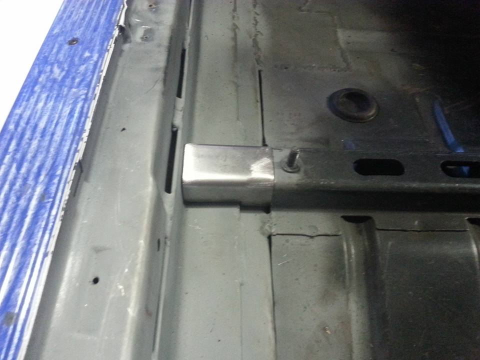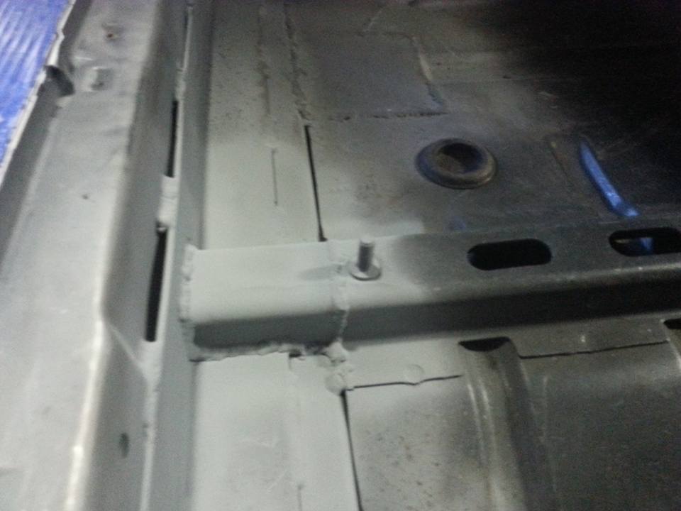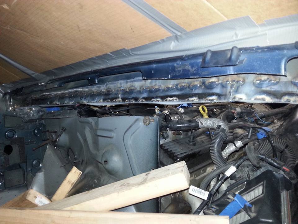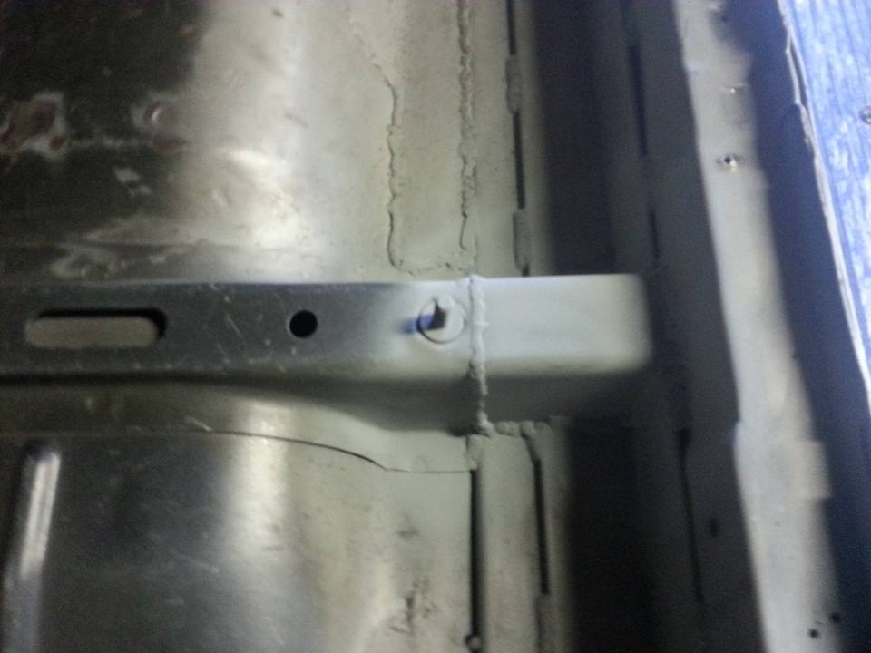 Bent up on the brake and welded in the missing sections of the seat rails. Also stitch welded in the back of the wiper cowl.