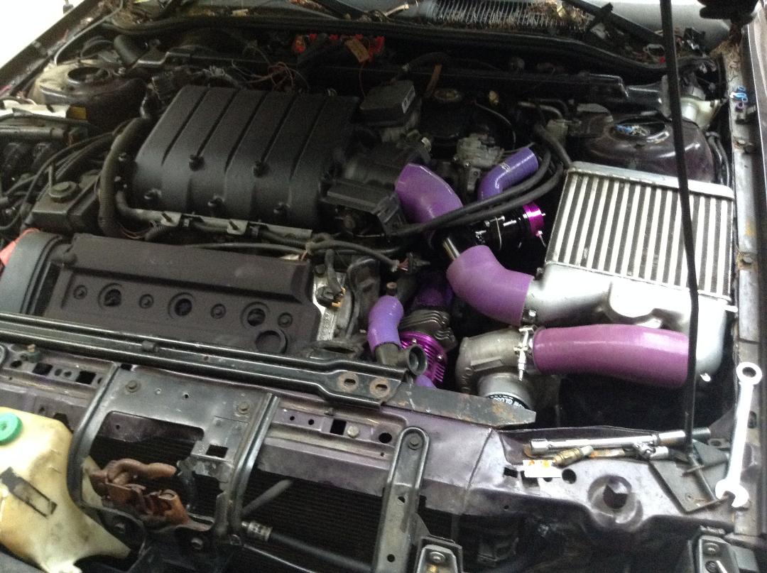 I plan on using stainless steel straps to hold the silicone intake fittings to the intercooler, with the T-Band clamps attaching the assembly to the throttle-body and the turbo. Should be very secure, clean, and compact. I still have to fab-up a bypass pipe from the valve to the intake pipe between the MAF and the turbo inlet, but I have a few of these silicone hose pieces from the Civic hose kit I bought. The color of the silicone couplers look very different in the picture, and there has been some UV fading from the parts sitting in the car, but it is all the same color except for the intake pipe from the turbo to the intercooler, which is unfortunately a shade off. I also have to make the dump-pipe from the wastegate, and build the exhaust system. Additionally, I need to install the clutch pedal assembly, but the hole for the master cylinder has already been cut.