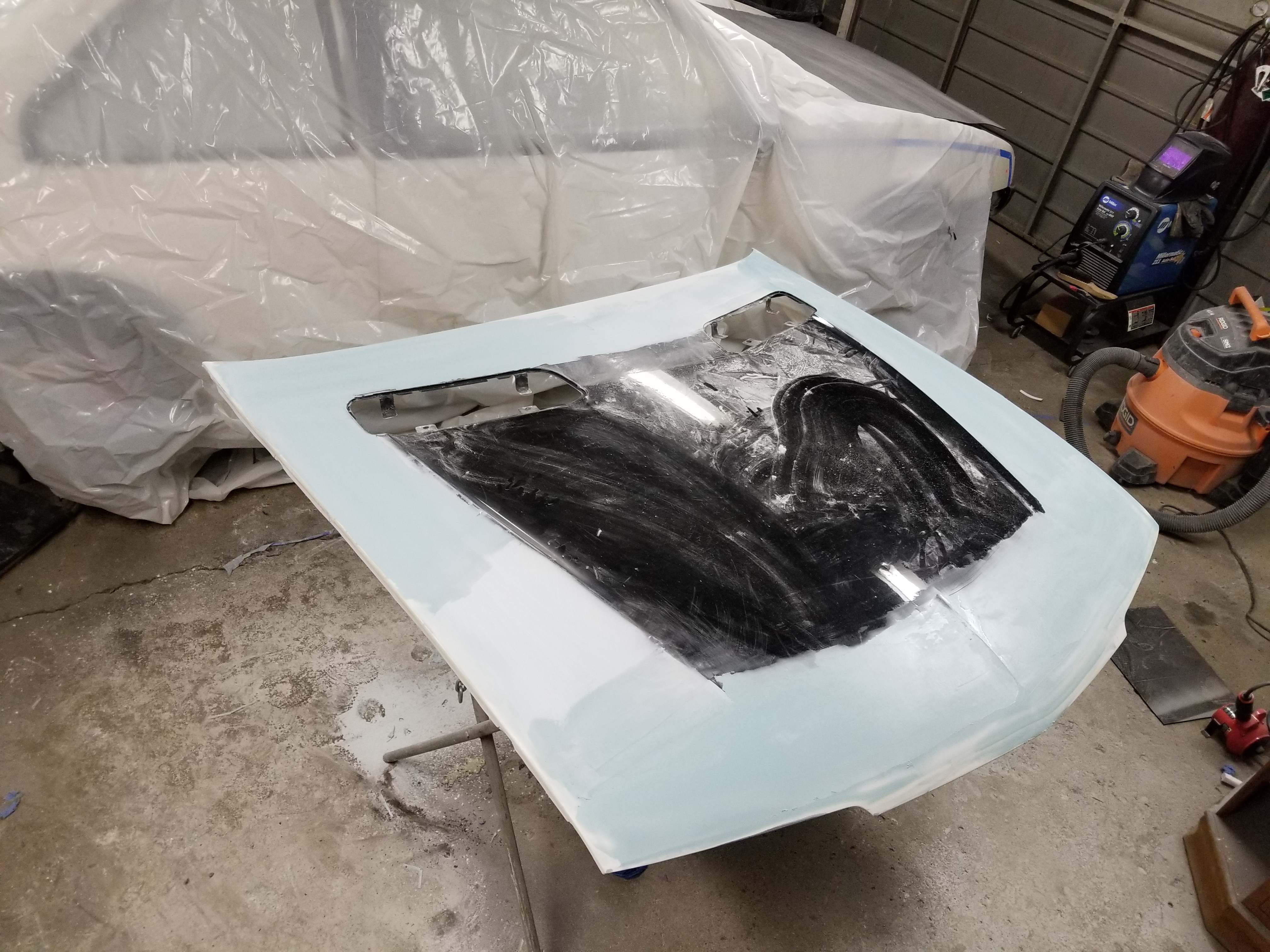 Hood progress coming along nicely. Body work done, all blocked out and reprimed.