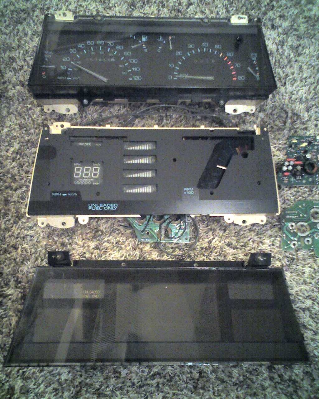 I liked how the middle cluster was coming out, but the electronics were fried on both of the Z-24 clusters I got, so I started playing with other options. I was playing with the new clusters because I replaced my seized original 5-speed with one from a Z-24, which uses a different VSS speed-sensor that is incompatible with the Beretta's speedometer.