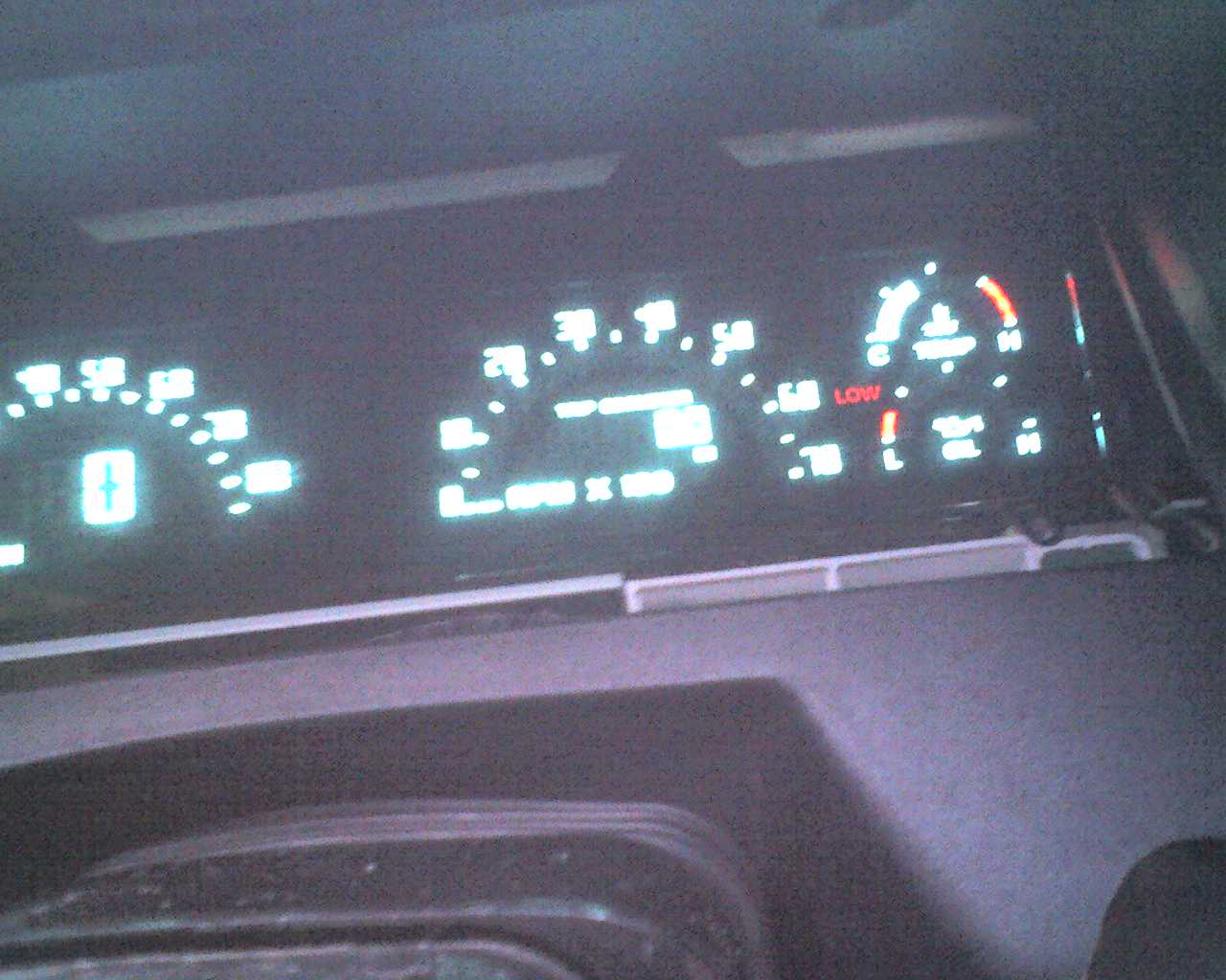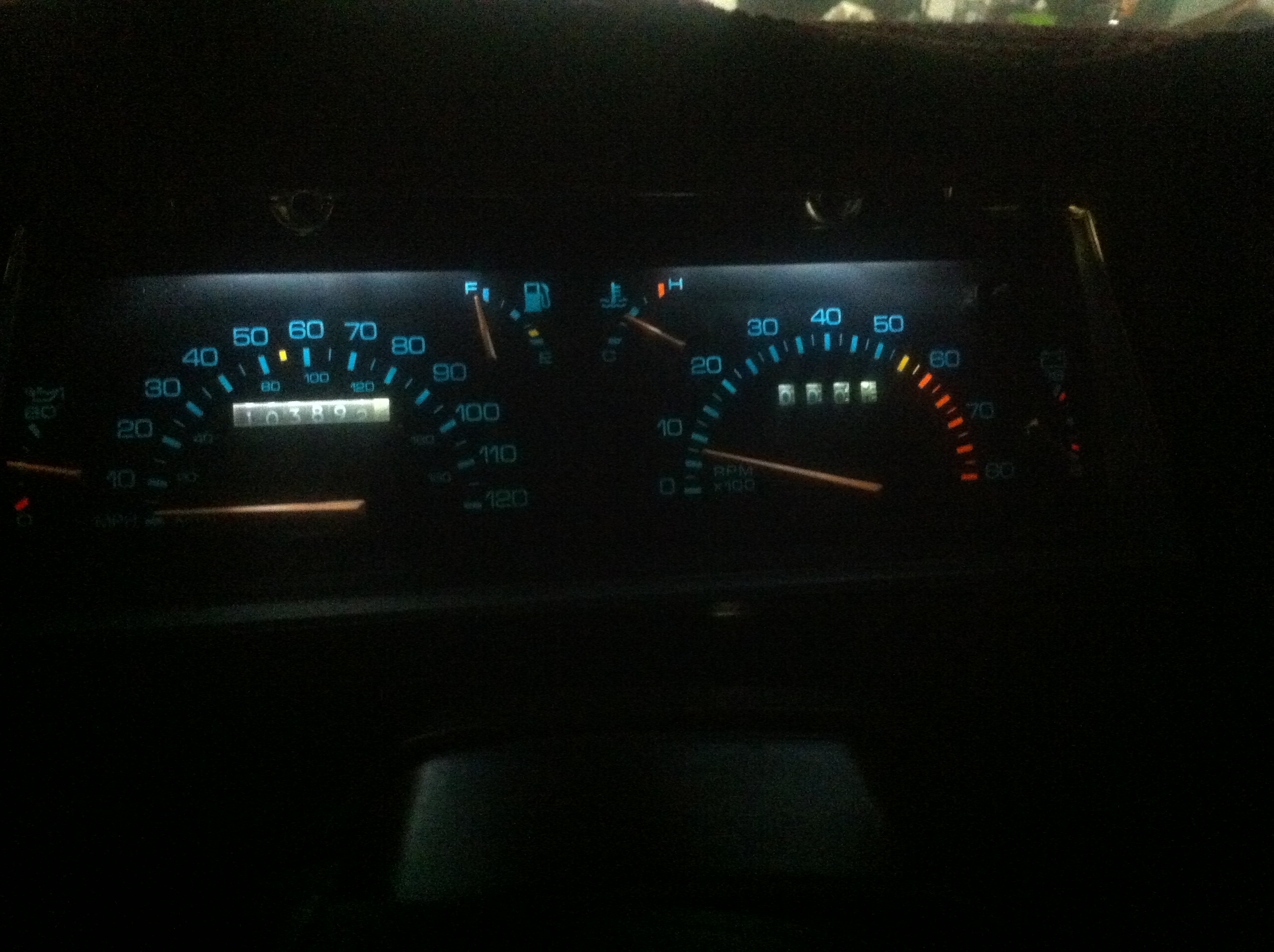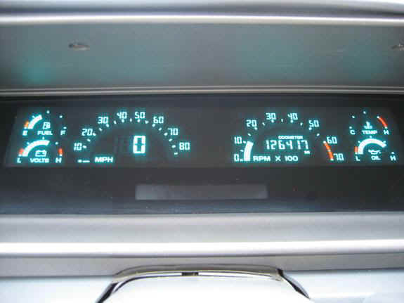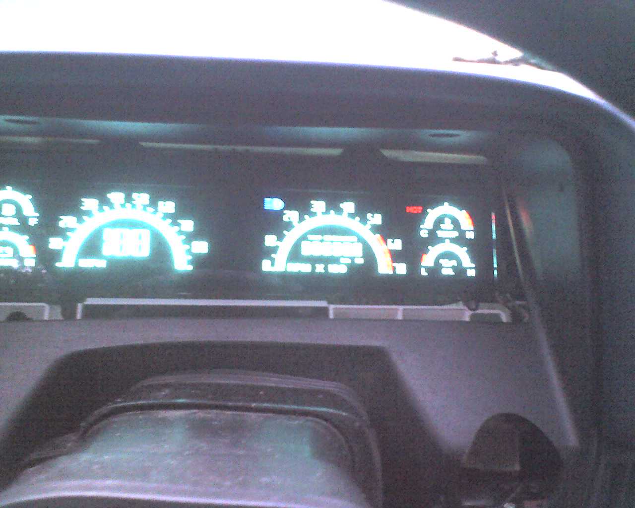 Top: My '90's analog cluster, grey needles, blue LED lighting.