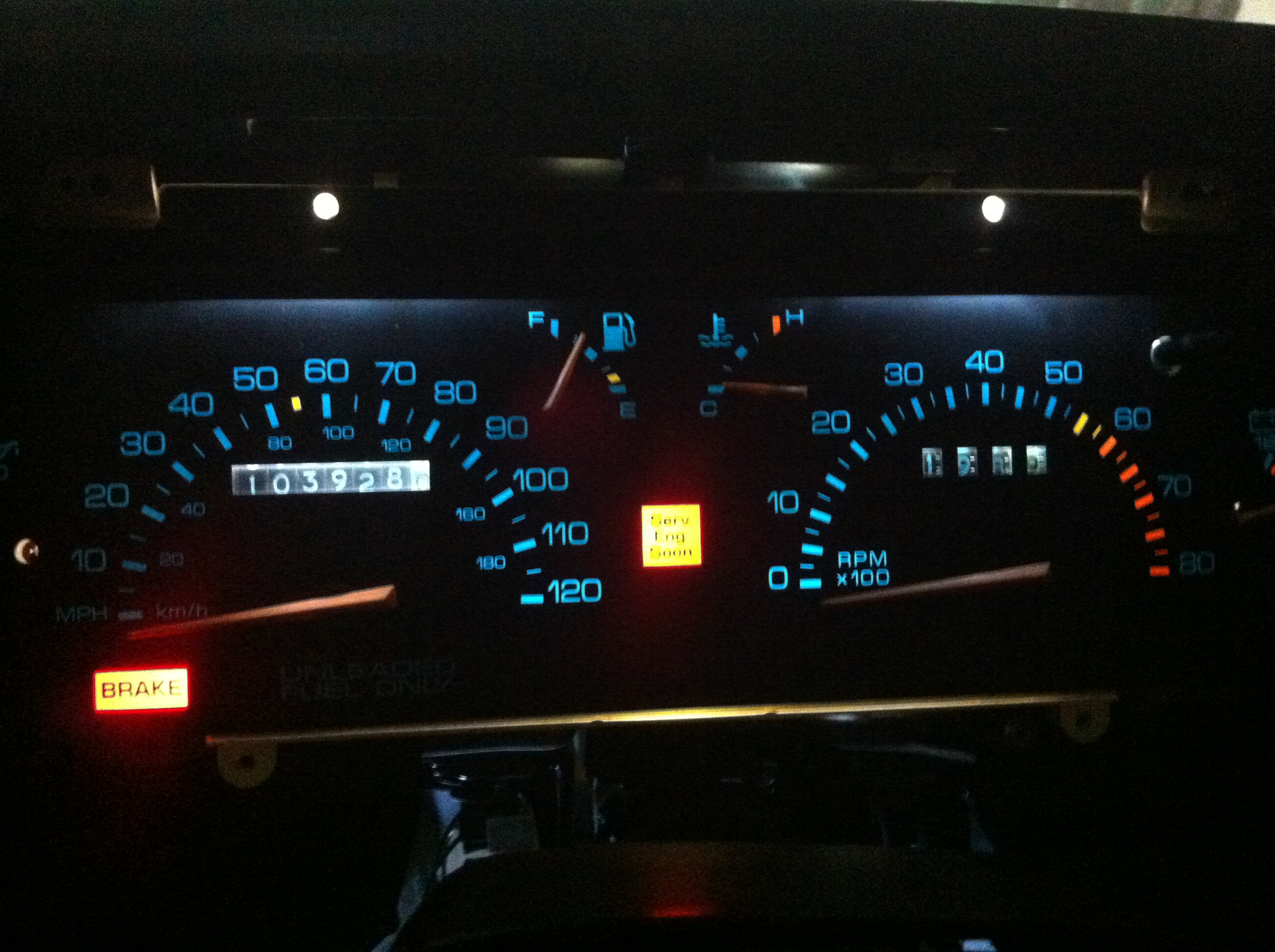 My crappy photos are courtesy of my 'ancient' phone. They are actually super-crisp, and much more readable than ANY analog display. Unfortunately, until I complete the wiring to the park-light switch to tell the cluster to dim for night-mode, it is stuck in full-bright, which means daytime visible. Once I splice in that one wire though, the dimmer function should work properly.