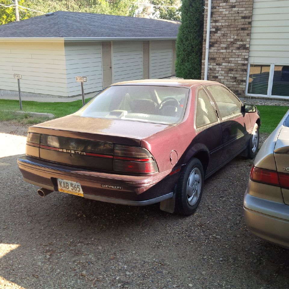 Well 2 years ago an older guy I work with told me he was looking to sell his 1996 Beretta. I had seen it parked by the building and thought, wow that Beretta is in good shape. He always drives slow, washed/waxed it and kept up good with maintenance. As you all know, it is getting hard to find decent original Berettas anymore. You can go days (weeks) without seeing a Beretta (other than your own lol), and then when you do, it’s rusted or crunched somewhere. Anyway, he was realistic on a price, and I have a teenage kid that I figured could use it. Well that was the plan at least, before I got kinda attached to it. You see, I had a red 88 Beretta GT in high school, and I found myself getting all nostalgic. Then I remembered what most high school kids do to cars, they beat on them. ((granted I did my share of racing around back then, but I also took care of my Retta, I have been a gear head since I could pick up a socket wrench)). Anyway, I got to thinking this car was in too good of shape to sacrifice on my kid. So I bought him something different and he proved me correct. The first two months he had this other auction car he bottomed out on a speed bump and crushed the oil pan and then he ‘took it just off the road’ and destroyed a CV axle. But I digress, so now I have this Beretta but I wanted it to look like the Z26. So I found a Z26 that had a great body, but motor issues. Bought it for cheap and had it shipped home. The shipping was more than the car! Anyway the plan was to put all needed parts to complete a Z26 conversion onto the 1996 base. Then I would have a mechanically solid Beretta that looked good too. Fast forward a year, we have a new baby, I have a new job, and I have a new project to work on. I went from a Z26 to a Z06 (see pic with my other son in it) so now with little time to work on the Beretta, I figured I would see if any other Beretta ‘enthusiasts’ would entertain my hopes of finishing a similar project. Money isn’t the issue, as I know that these cars aren’t worth a ton no matter what shape they are in, but with the car being in such good shape, I hoped it would find a good home. I am currently working on getting the intake gasket fixed on the 96 Retta, as it is just starting to leak coolant externally. Anyway that’s the story. Chances are good no one will offer a realistic amount based on distance to N Dakota and the fact that he Z does not run. So I figure that after my teen has some experience driving, he and I can work together to do this Z26 conversion and then maybe he would learn to appreciate things more. But then my wife gripes she is sick of all the cars I seem to have sittin around, so I figured I would try to move these two at once. I do still have both Berettas. Sorry for the long post…
