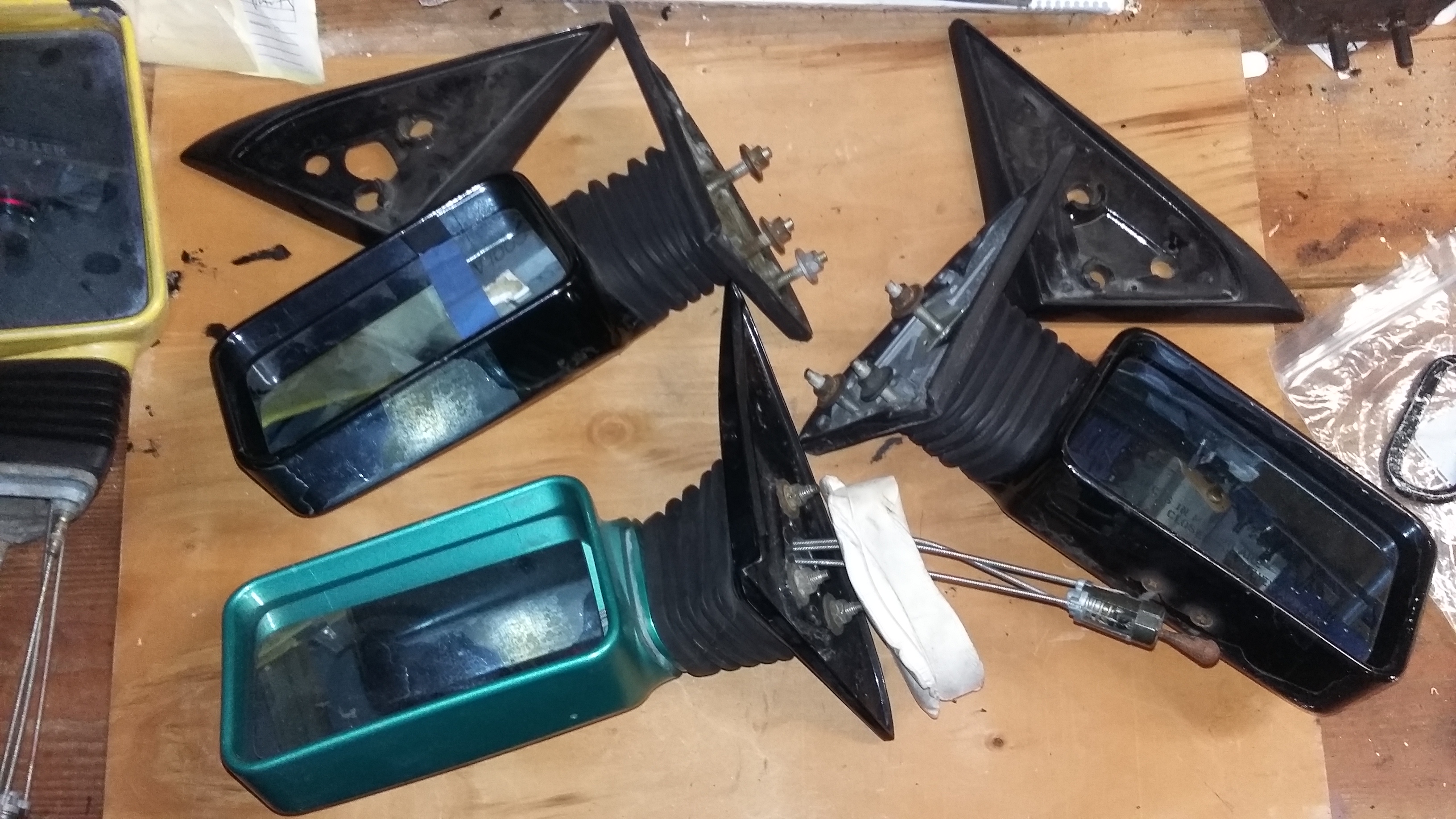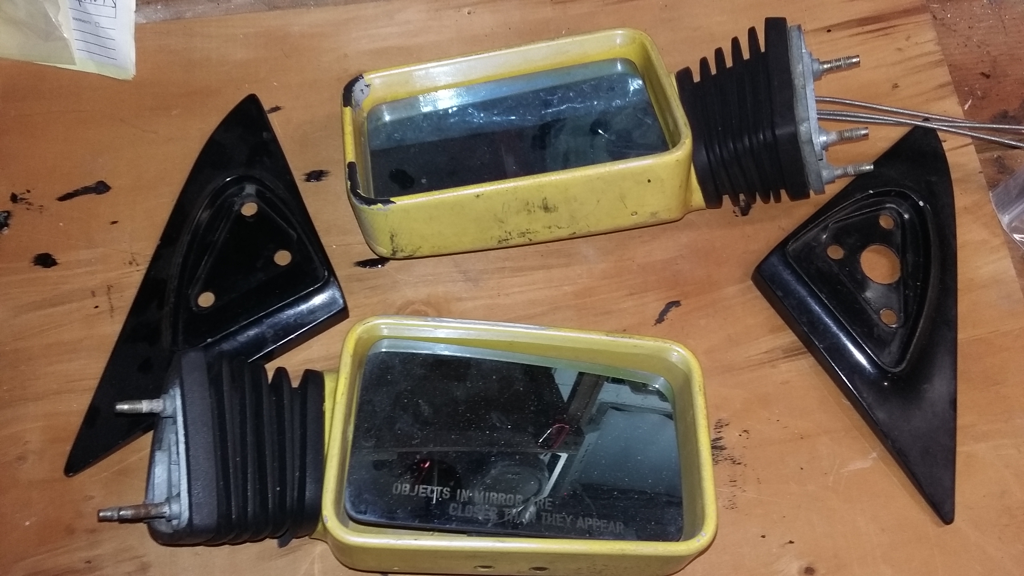 Have 2 sets of gtu/indy mirrors as well. Yellow set from an indy are solid with terrible paint but original blue glass. Black set comes with a spare teal indy drivers side as the indy has a busted pivot arm but good blue glass, and the black drivers side has cracked glass and no adjustment cord. Basically need to swap the guts from the teal to the black. Looking to get $80 per set plus shipping.