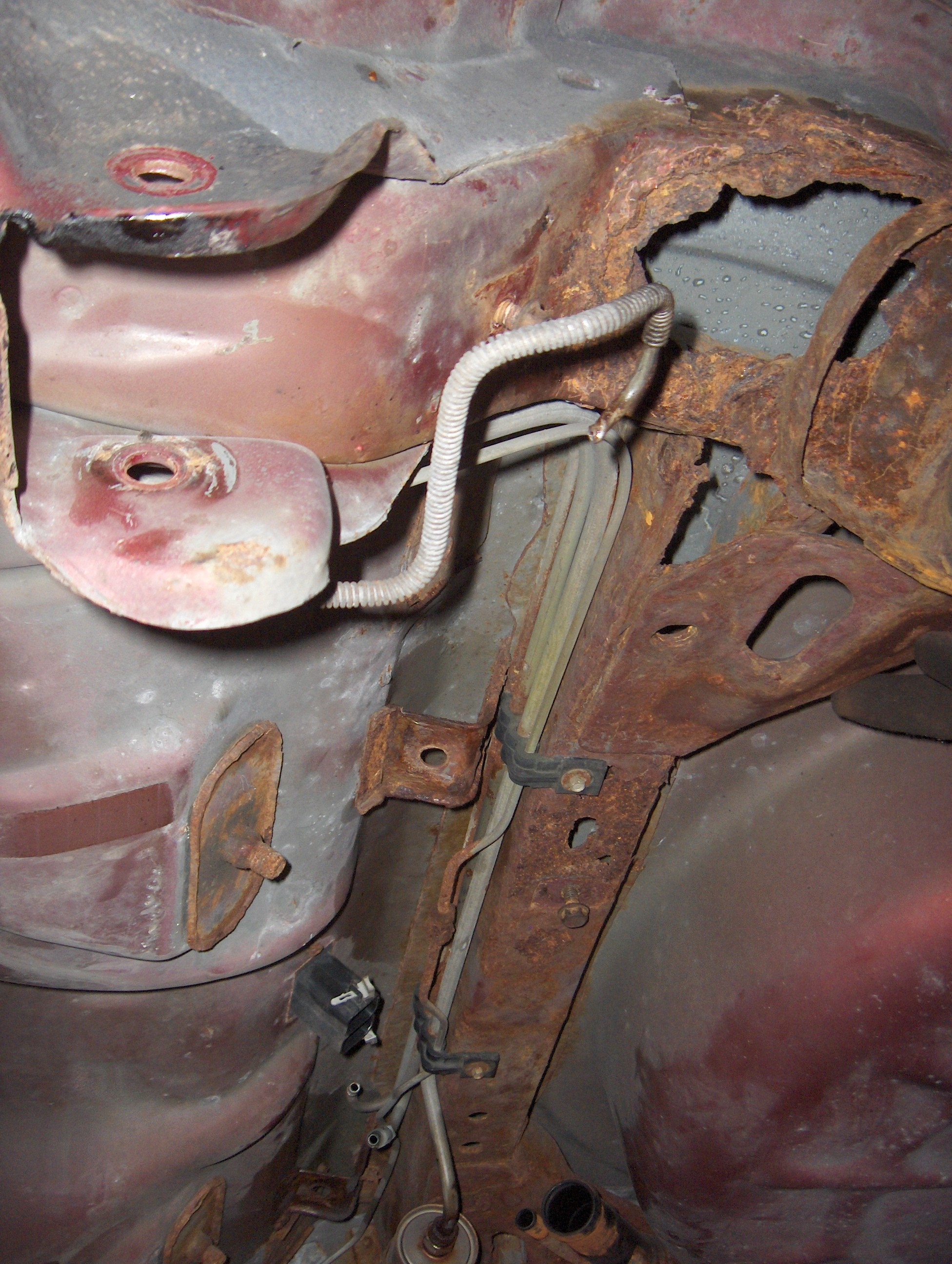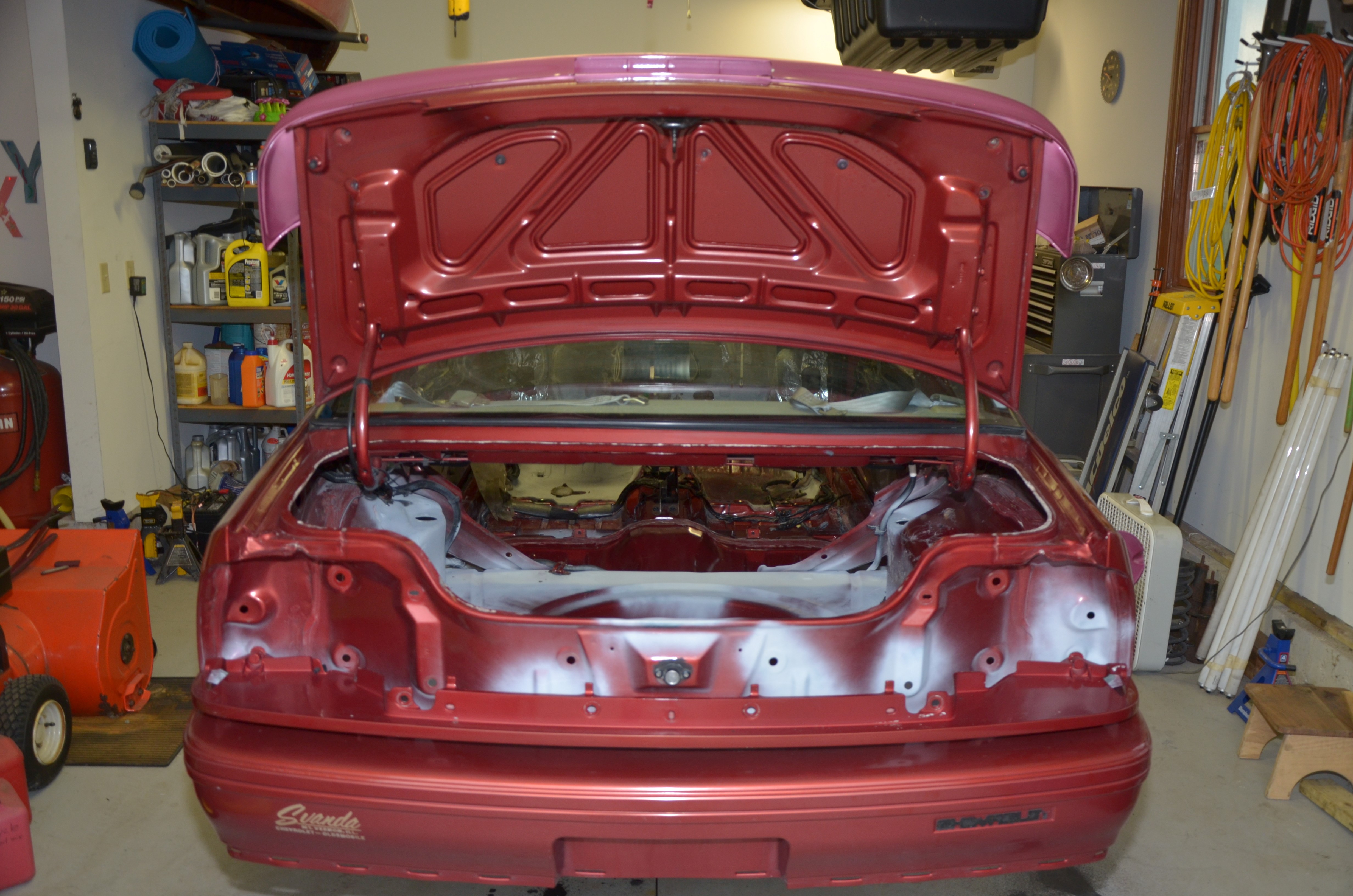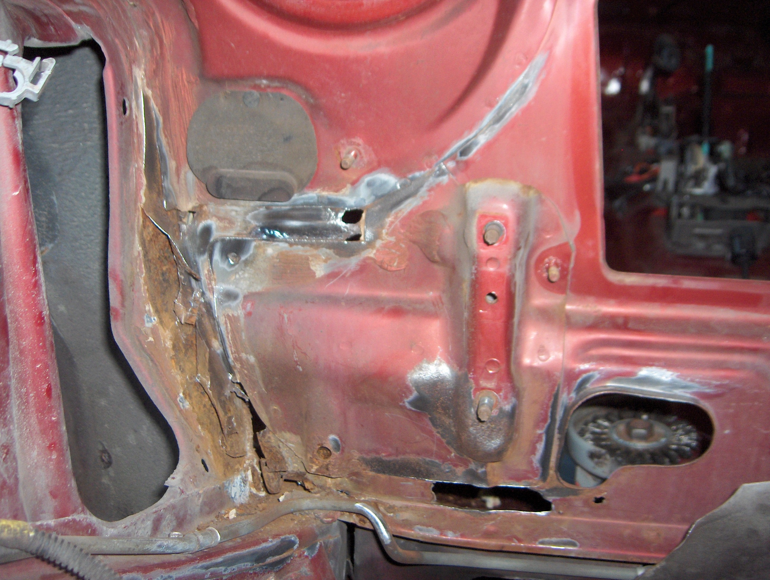 I had a body shop do the rockers because they were the part I was most afraid of at the start. $1700 and some less than perfect work and I had something that looks acceptable. As I pulled the interior and engine I discovered the cause of the wet carpets. The lack of cowl sealing led to extensive rust and leaks in the cowl and firewall. The passenger side behind the steering rack mount and reinforcement was the worst, but the lower driver's side was bad too. At this point I was in over my head and "The Plan" was out the window, but I just figured the only way out was forward. I cut as much as I dared out, and started welding. I should mention I am not a welder, but I just dove in. With new metal in I sealed everything with SEM 2 part seam sealer and moved to the rear. The car was now on a makeshift cart with casters and I started looking into the rear spring perches. Yeah they were bad. I thought about starting the fabrication, then I got nauseous. Changed course and bought a $300 95 Z26 with 56,000 miles and a blown engine from Vegas. $800 for shipping and I had a parts car. I needed the doors, fender, and parts to repair the rear. The donor car was very clean, and I considered just building on it since it was so clean. The Wife beat me for my insolence and I fell back in line.